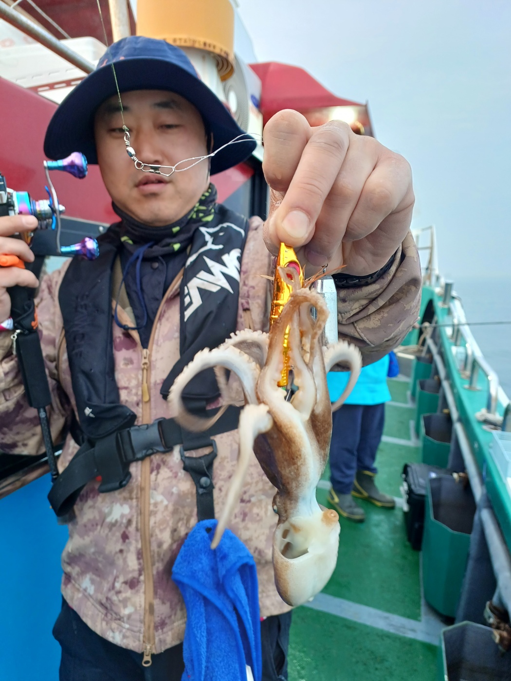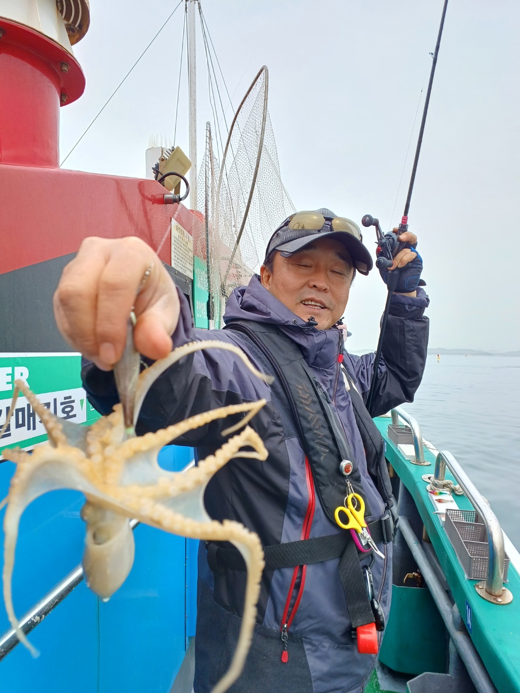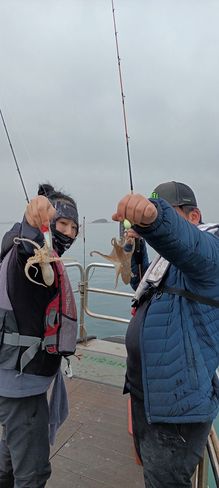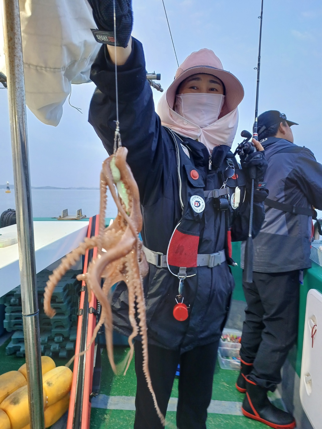 날물 정조끝나고 들물에는 역시 사리물때라 어렵다 판단하고 조사님들께 양해를 구하고 다운샷으로 변경하였으나 고기가 나오질 않네요. 물의 속도가 느려지는 시간 다시 쭈꾸미로 하고 포인트 도착하니 왕쭈꾸미들이 연거푸 나옵니다.