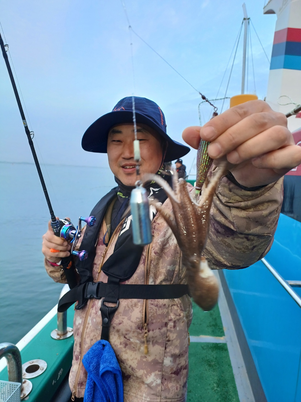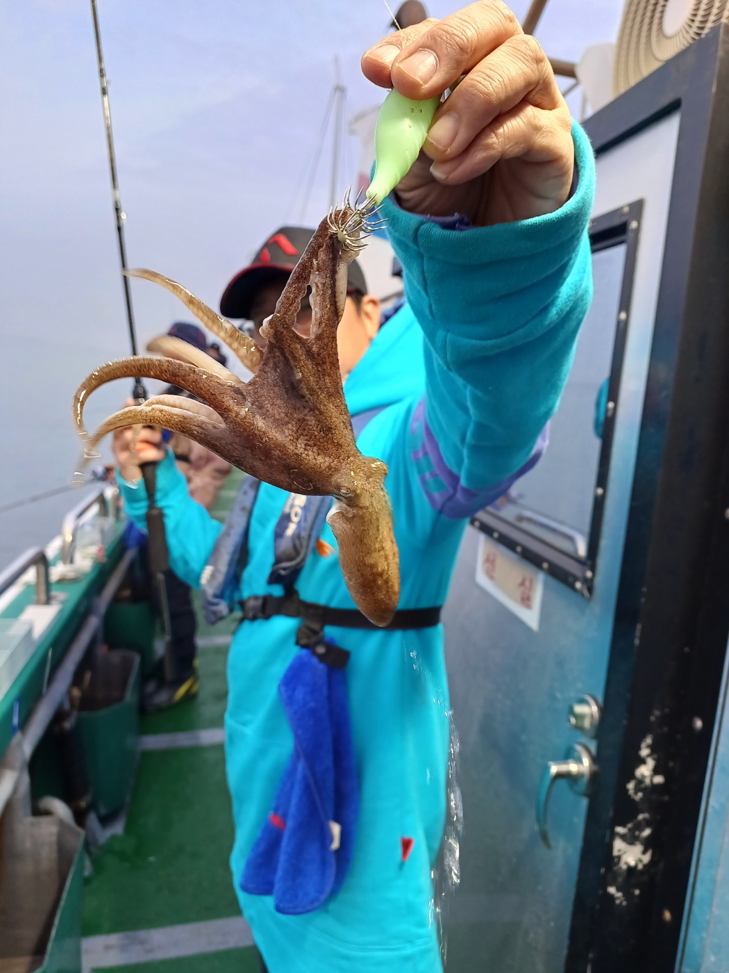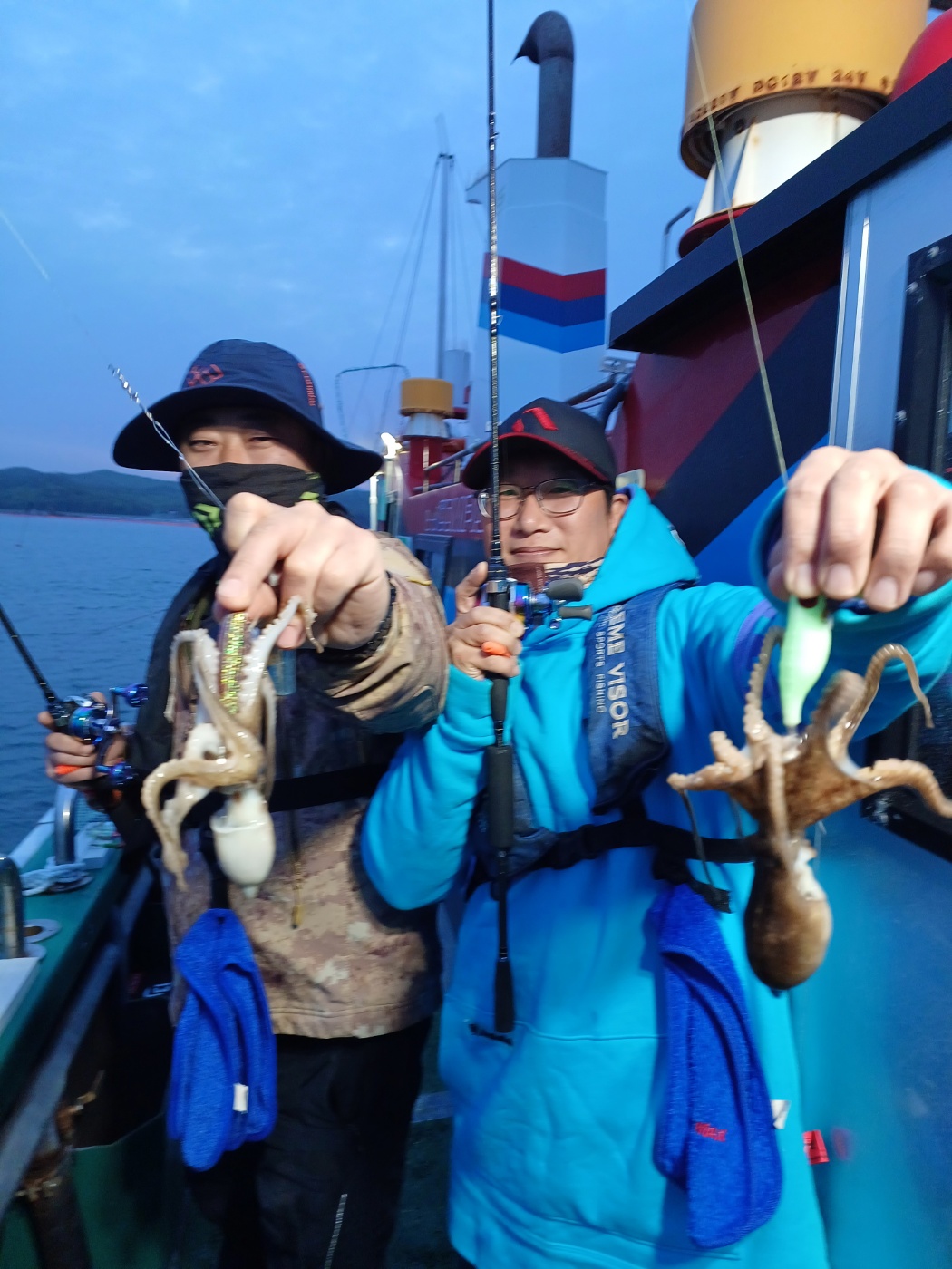 날물 정조끝나고 들물에는 역시 사리물때라 어렵다 판단하고 조사님들께 양해를 구하고 다운샷으로 변경하였으나 고기가 나오질 않네요. 물의 속도가 느려지는 시간 다시 쭈꾸미로 하고 포인트 도착하니 왕쭈꾸미들이 연거푸 나옵니다.